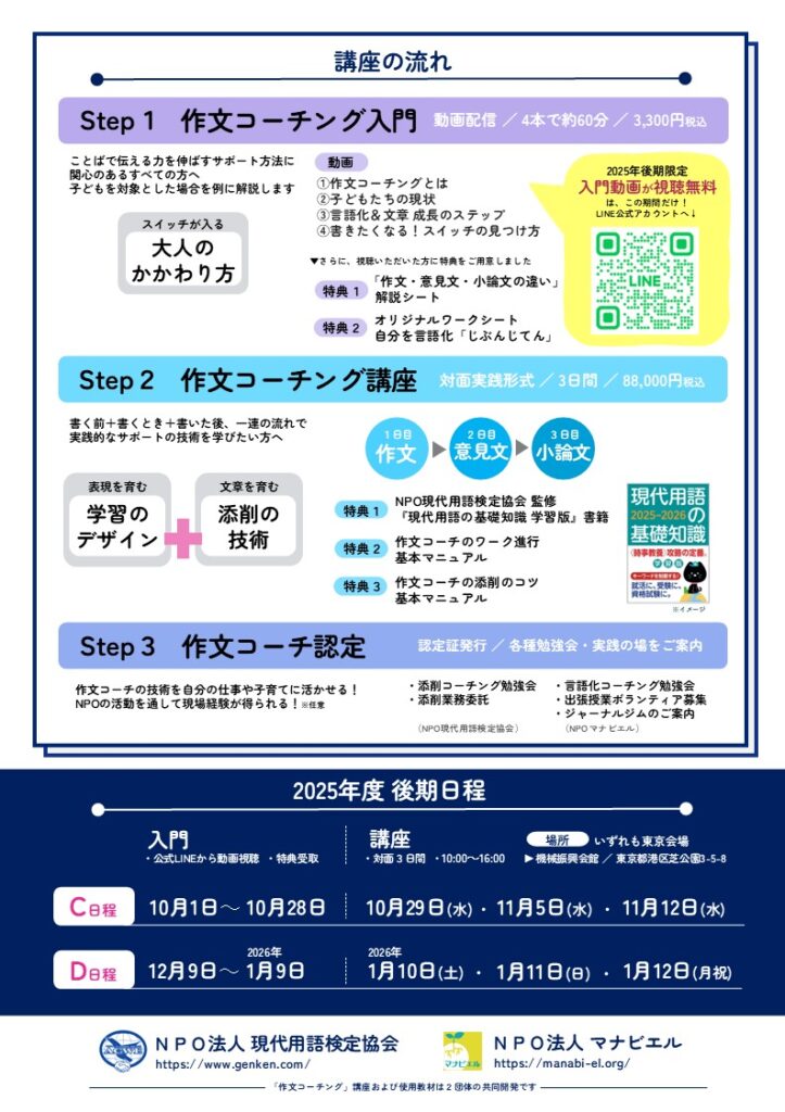 まずは、「Step1 作文コーチング入門」にお申し込みください(2025年後期限定、「作文コーチング」LINE公式アカウントに登録していただくと、無料でご視聴いただけます)。保護者や指導者の方など、どなたでも気軽に視聴できる合計約60分間の動画です。入門をご受講いただいた方への特典として、ここでしか手に入らない作文に関する資料・教材をプレゼントします。